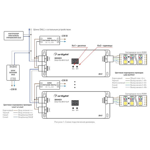 | Дополнительные параметры | Имеет 4 настраиваемых выхода, может работать в одном из 4 режимов:, режим DIM (1 DALI-адрес) — все каналы управляются одновременно, режим MIX (2 DALI-адреса) — каналы управляются попарно, режим RGB (3 DALI-адреса) — каналы 1-3 управляются индивидуально, режим RGBW (4 DALI-адреса) — все каналы управляются индивидуально, максимальный ток одного выхода — 5 А, максимальная мощность нагрузки —240 Вт (12 В), 480 Вт (24 В), 720 Вт (36 В) |