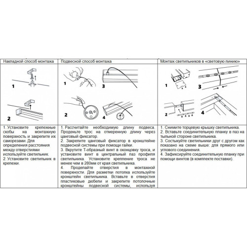 | Дополнительные параметры | три способа монтажа светильника:, накладной способ монтажа, подвесной способ монтажа, vонтаж светильников в световую линию |