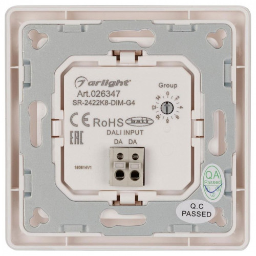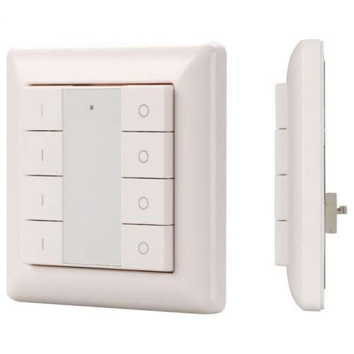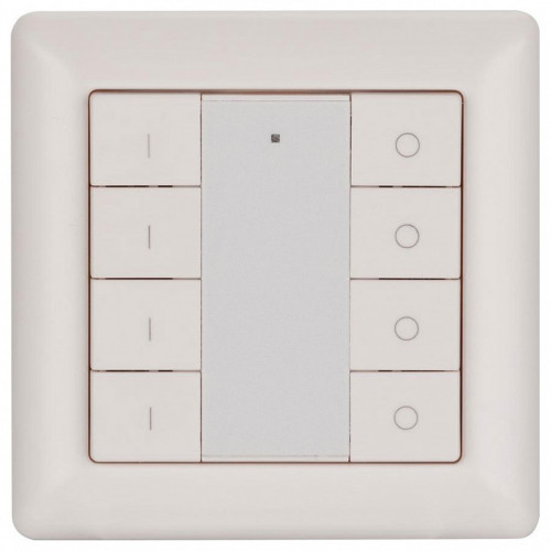| Дополнительные параметры | Встраиваемая кнопочная белая пластиковая панель для работы по протоколу DALI. Напряжение питания — 16 В (питание от шины DALI). Протолок управления — DALI DT 6. Количество групп управления — 4 группы. Установка номера первой группы выполняется переключателями на корпусе. 8 кнопок (4-е группы) 3 функции каждой группы (ВКЛ / ВЫКЛ / ДИММИРОВАНИЕ). Питание от шины DALI (4 мА) |