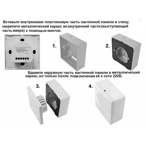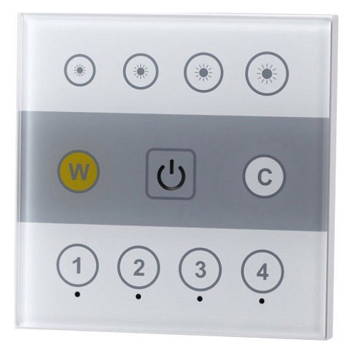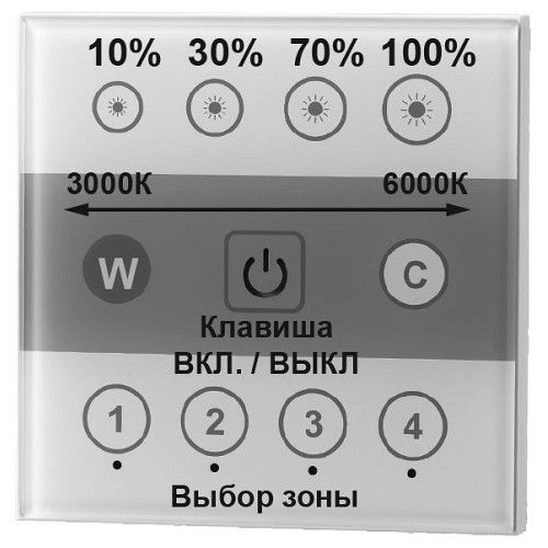 | Дополнительные параметры | Настенная панель дистанционного управления (2.4G) для светодиодных источников света. Рабочее напряжение 90-265В (50/60 Гц); частота передачи сигнала 2,4 ГГц; дистанционное расстояние 20 метров. Стильный дизайн, уникальный интерфейс, удобная установка и простота в эксплуатации. Внутри панели находится очень чувствительный сенсорный чип управления, реагирующий даже на слабые прикосновения., Описание работы клавиш:, Клавиша ВКЛ. / ВЫКЛ - включение/выключение панели; Клавиша 10%/i> - Яркость светильника составит только 10% из 100%; Клавиша 30%/i> - Яркость светильника составит только 30% из 100%; Клавиша 70%/i> - Яркость светильника составит только 70% из 100%; Клавиша 100%/i> - Яркость светильника составит 100% из 100% (максимальная яркость); Клавиша W/i> – при длительном нажатии (более 3 секунд) цветовая температура будет постепенно меняться, становится более «холодной»; при коротком нажатием цветовая температура будет добавлять +5°., Клавиша C/i> - при длительном нажатии (более 3 секунд) цветовая температура будет постепенно меняться, становится более «теплой»; при коротком нажатием цветовая температура будет добавлять +5°., Выбор зоны/i> - каждая из 4 зон может управляться индивидуально, но вы можете выбрать только 1 зону для управления, одновременно несколькими зонами управлять не возможно. |