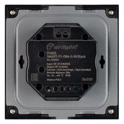 | Дополнительное описание | Встраиваемая роторная панель 2.4 ГГц, цвет чёрный. Материал - стекло/пластик. Для управления одноцветными источниками света (ШИМ). Управление яркостью с помощью роторного вращателя. Питание/рабочее напряжение 3VDC от батарейки CR2032. Габариты 86х86х48 мм. Предназначена для установки в стандартный подрозетник. Панель совместима с диммерами серии SMART. |