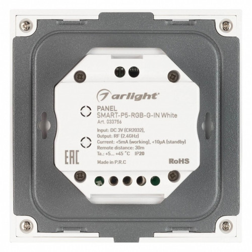 | Дополнительное описание | Встраиваемая роторная панель 2.4 ГГц, цвет белый. Материал - стекло/пластик. Для управления RGB источниками света (ШИМ). Управление яркостью с помощью роторного вращателя. Питание/рабочее напряжение 3VDC от батарейки CR2032. Габариты 86х86х48 мм. Предназначена для установки в стандартный подрозетник. Панель совместима с контроллерами серии SMART. |