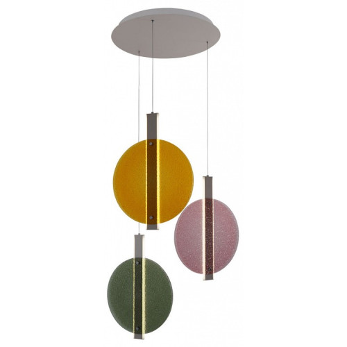 | Дополнительные параметры | Металлическое основание подвесной люстры гальванизировано в цвет никеля. Корпус плафонов выполнен из сплава алюминия с цинком и гальванизирован в цвет основания. Светодиодные источники света закрыты матовым акрилом. Подвесная люстра декорирована фактурным стеклом, окрашенным в массе в зеленый, желтый и розовый цвета. |