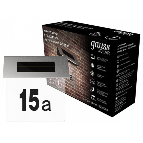| Дополнительные параметры | Светильник на солнечных батареях (номер дома с подсветкой) Gauss серии Solar предназначен для подсветки указания номера дома. Номер дома с подсветкой Gauss работает от солнечной батареи, использующей энергию солнца для зарядки встроенного аккумулятора, поэтому является экологически чистым и экономит электроэнергию. Номер дома с подсветкой не требует подключения к сети, что позволяет устанавливать его в любых, даже труднодоступных местах. Номер дома с подсветкой на солнечной батарее можно использовать круглый год, потому что он заряжается даже при облачной погоде и устойчив к изменению погоды и температуры. Солнечная панель: 2V80MA; Емкость батареи: 1.2V AA NI-MH400MAH; Время заряда: 6-8 часов; Время работы: 8-10 часов. |