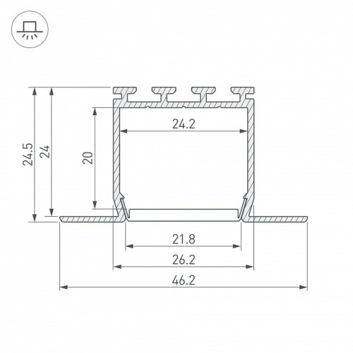 | Дополнительные параметры | Алюминиевый встраиваемый профиль для светодиодных лент и линеек. Ширина площадки для ленты 22 мм. Экраны, заглушки и другие аксессуары приобретаются отдельно. КПД профиля (cветовой): 83 % Ширина площадки: 20.1-25.0 мм Ширина световой линии: 20.1-25.0 мм Ширина: 50.1-60.0 мм Рассеиваемая тепловая мощность на 1м: max: 33.2 Вт Способ монтажа: Встраиваемый с накладным фланцем |