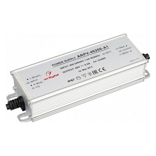 | Дополнительные параметры | Источник напряжения с гальванической развязкой для светодиодных изделий. Входное напряжение 200-240 VAC. Выходные параметры: 48 В, 4.2 А, 200 Вт. Встроенный PFC >0,5. Герметичный алюминиевый корпус IP 67. Рабочая температура -40…+70C⁰. Габаритные размеры длина 174 мм, ширина 56 мм, высота 36 мм. Гарантийный срок 3 года. |