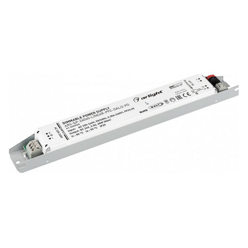 | Дополнительные параметры | Диммируемый источник напряжения по протоколу DALI 2.0 и функцией PUSH DIM с гальванической развязкой для светодиодных изделий. Входное напряжение 220-240 VAC. Выходные параметры: 24 В, 2,5 А, 60 Вт. Встроенный PFC >0,95. Негерметичный алюминиевый корпус IP 20.Габаритные размеры длина 250 мм, ширина 30 мм, высота 21 мм. Гарантийный срок 5 лет. |