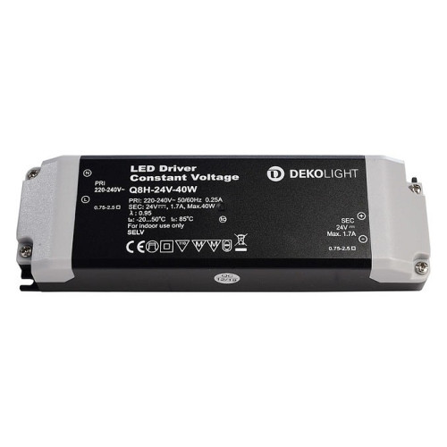 | Дополнительные параметры | Deko-Light Power supply unit, BASIC, CV, Q8H-24-40W, input voltage: 220-240V AC/50-60Hz, output voltage: 24V DC, output current: 0-1700 mA, 40,00 W, IP20 |