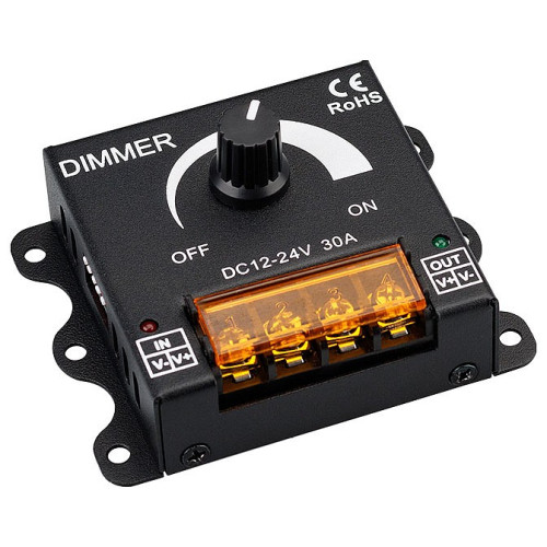 | Дополнительные параметры | Диммер без ПДУ (потенциометр)., Напряжение питания DC 12-24V, выходной ток 30А, мощность нагрузки 360-720W., Габариты 82x64x40 мм. |