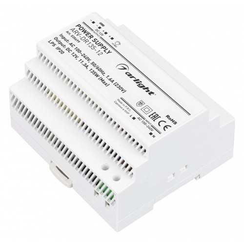 | Дополнительное описание | Источник напряжения с гальванической развязкой для светодиодных изделий. Входное напряжение 100-240 VAC. Выходные параметры: 12 В, 11.3 А, 135 Вт. Негерметичный пластиковый корпус IP 20 для установки на DIN-рейку. Габаритные размеры длина 90 мм, ширина 105 мм, высота 58 мм. Гарантийный срок 3 года. |