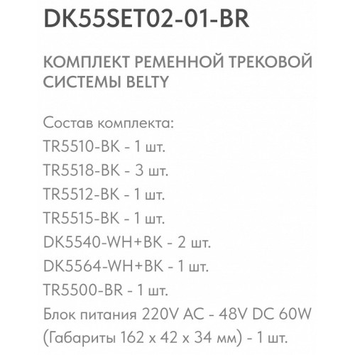 | Компоненты, входящие в комплект | основание TR5510-BK - 1 шт., крепеж крепеж TR5518-BK - 3 шт., основание TR5512-BK- 1 шт., основание TR5515-BK - 1 шт., светильник DK5540-WH+BK - 2 шт., светильник DK5564-WH+BK - 1 шт., шинопровод TR5500-BR - 1 шт., блок питания 220V AC - 48V DC 60W (Габариты 162 x 42 x 34 мм) |