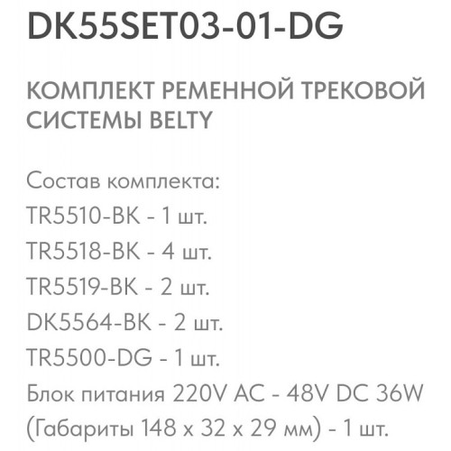 Компоненты, входящие в комплект | основание TR5510-BK - 1 шт., крепеж крепеж TR5518-BK - 4 шт., крепеж TR5519-BK - 2 шт., светильник DK5564-BK - 2 шт., шинопровод TR5500-DG - 1 шт., блок питания 220V AC - 48V DC 36W (Габариты 148 x 32 x 29 мм), |