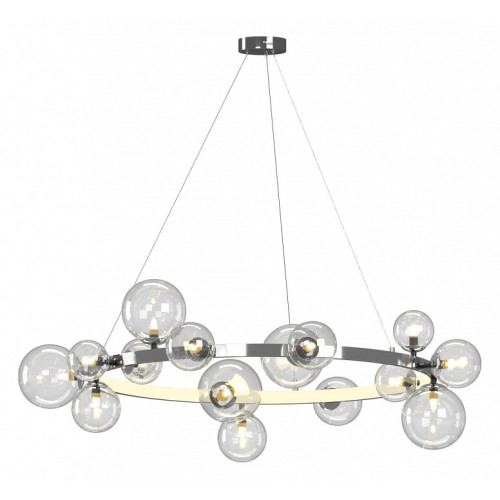 | Дополнительные параметры | Подвесная люстра в хроме с плафонами в виде шаров - идеальное сочетание дизайна и красоты. Изысканная модель отлично подойдет для установки на потолок в гостиной, спальни или детской комнаты, оформленной в современном стиле. Двенадцать шаров осветят комнату 18квм. Светодиодная подсветка по окружности кольца придает люстре вид облака. Модель на трех тросах, которые еле заметны и вместе с шарами создают эффект воздушности. Подвесы регулируется по высоте. |