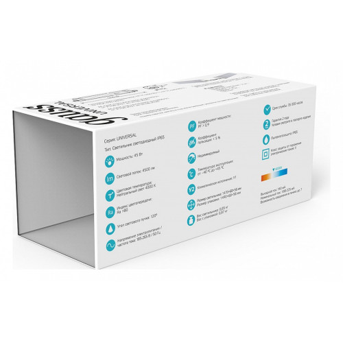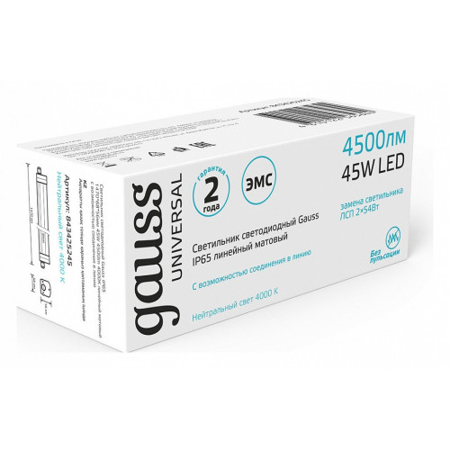 | Дополнительные параметры | Светильники ЛСП IP65 Universal с цветовой температурой 4000К и 6500К предназначены для освещения автомоек, парковок, подсобных помещений, пешеходных переходов и лестничных пролетов, и других помещений, где требуется высокий уровень защиты от пыли и влаги IP65. Особенностью данной серии является возможность подключения светильников в линию до 20шт. Эта функция снимает необходимость подводить кабель питания 220В к каждому светильнику, что значительно ускоряет монтаж и снижает издержки на материалах и оплате услуг электромонтажников. Качественные светодиоды Sanan с эффективностью до 90 лм/В и широкий диапазон рабочих температур -40 + 45°C позволяет использовать серию Universal в профессиональном сегменте, где требуются светильники с высокой светоотдачей и стойкие к внешним факторам окружающей среды. |