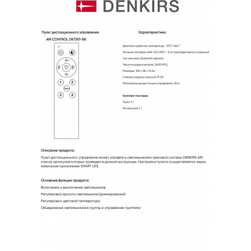 | Дополнительные параметры | Пульт дистанционного управления подходит для работы с управляемыми светильниками трековой системы DENKIRS AIR и способен управлять четырьмя независимыми группами освещения. Настройка пульта осуществляется через мобильное приложение SMART LIFE. |