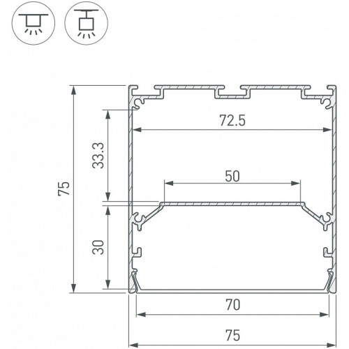 | Дополнительные параметры | Глубина установки источника света: 30 мм рассеиваемая тепловая мощность на 1м: max: 78 W отсек для БП, ширина: 72,5 мм отсек для БП, высота: 33,3 мм. |