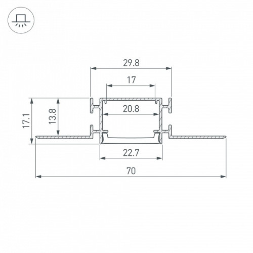 | Дополнительные параметры | КПД профиля: 76 % Рассеиваемая тепловая мощность на 1м: 23 Вт Глубина установки источника света: 16 мм Профиль со скрытым фланцем встраивается в потолки и потолочные ниши из гипсокартона. Рекомендуем использовать с лентой RZ. Минимальный радиус изгиба 50 см. Алюминиевый встраиваемый гибкий профиль для светодиодных лент и линеек. Изгиб вправо/влево. Экраны, заглушки и другие аксессуары приобретаются отдельно. |