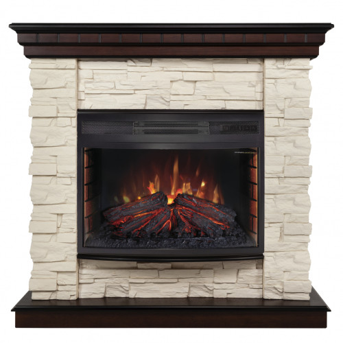 Электрический камин в сборе с очагом. Лаконичный дизайн делает его универсальным для разных интерьеров и уместным как для квартиры, так и для дачи. Изготовлен из МДФ и литого камня. В комплекте используется электрический очаг FireField 25 SIR с потрясающим эффектом пламени и муляжом дров, расположенных за панорамным фронтальным стеклом. С помощью регулятора яркости огня можно задать желаемую интенсивность (доступно 4 уровня регулировки). Очаг оснащен инфракрасным обогревателем, спрятанным в верхней части и обеспечивающим тепло в холодную погоду. Инфракрасный обогреватель является самым современным способом прогрева и обладает рядом преимуществ, такими как: направленность, высокая скорость обогрева, отсутствие запахов и экономия электричества.